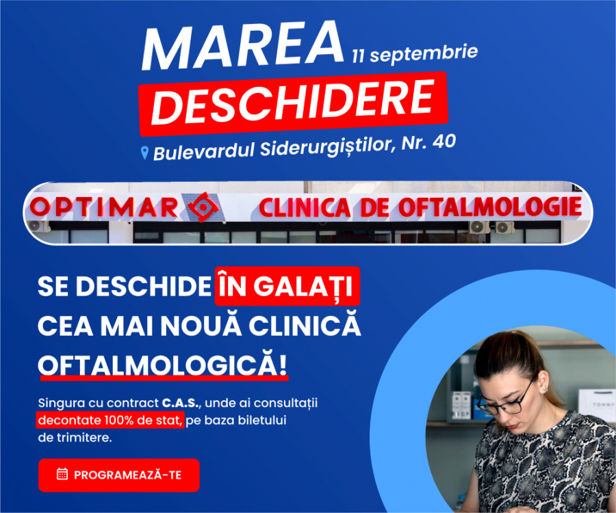 Galațiul se bucură de deschiderea OPTIMAR, o clinică exclusiv oftalmologică ce promite standarde la nivel european. Laboratorul medical și spațiul modern oferă consultații decontate prin CNAS pentru pacienții cu bilet de trimitere, asigurând acces rapid la evaluări și intervenții în sănătatea ochilor.